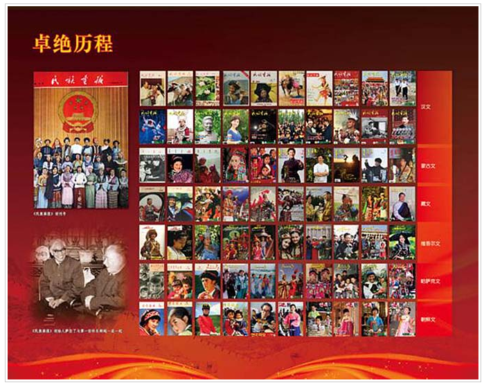 《民族畫報(bào)》創(chuàng)刊于1955年2月,周恩來總理題寫刊名?!睹褡瀹媹?bào)》用漢、蒙古、藏、維吾爾、哈薩克、朝鮮等6種文字出版,發(fā)行全國各省市區(qū)及世界50多個(gè)國家和地區(qū),一直與《人民畫報(bào)》《解放軍畫報(bào)》并成為“中國三大畫報(bào)”。2013年獲“中國百強(qiáng)期刊”稱號