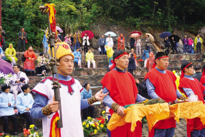 煙雨迷蒙中,頭飾百合花的童男童女,手捧水果籃的少男少女,以及身著傳統(tǒng)服飾的老年男女等,在祭師的帶領下魚貫進入祭祀場。