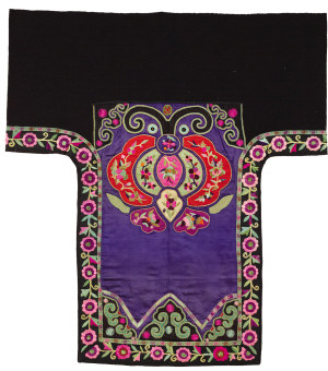 北京服裝學(xué)院民族服飾博物館藏貴州雷山地區(qū)苗族花蝶紋貼補(bǔ)刺繡背扇片。