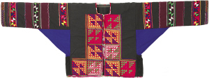 再來(lái)看這件藏品:彝族五彩棉拼布對(duì)襟女上衣。第一眼吸引人的,應(yīng)該是那鮮艷的色彩和可愛(ài)的小三角,鮮艷、喜慶、熱鬧,它幾乎符合人們對(duì)于少數(shù)民族服飾的一切想象。仔細(xì)觀察、品讀后,可發(fā)現(xiàn)這件上衣細(xì)節(jié)的妙趣之處:第一,雖然衣身的色彩鮮艷,可所有顏色都被制作者按對(duì)比色的關(guān)系排列著——紅與綠、藍(lán)與黃、黑與白,呈現(xiàn)出活潑跳躍、多而不亂的效果。第二,服裝上所有的圖形元素,不是用三角形組合成方形,就是方形中套著三角形——腋下兩塊藍(lán)色的三角結(jié)構(gòu)是由方形對(duì)折而來(lái);領(lǐng)口也沒(méi)有裁成常規(guī)的圓領(lǐng),而是做成了與衣身拼布相呼應(yīng)的方形。如此一來(lái),各種零碎的裝飾元素被牢牢地統(tǒng)一的方形框架中,顯得協(xié)調(diào)有序,又不失細(xì)節(jié)趣味。
