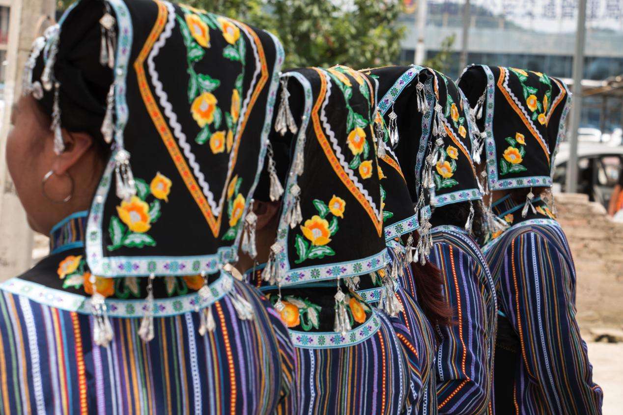 沙坡村布依族女性的傳統(tǒng)服為,頭戴黑色打底的方巾,方巾上繡有大面積花圖案作為裝飾,在方巾周邊還繡有花邊,花邊處串連有銀飾作為裝飾。上身主要為黑色打底的條紋對襟衣和圍腰,上衣肩頸處繡有花朵圖案,圍腰上部也繡有大面積花草圖案,兩袖袖口處同樣也繡有花草圖案。下身則以黑色打底的百褶裙為主,百褶裙底部繡有條紋圖案。