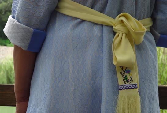 斜襟短衣外的圍腰上部與斜翼兩側(cè)鳥(niǎo)獸花紋,圍腰大部分為純色,色彩選擇較多。而垂在腰后的彩帶尾部有流蘇,助以美觀和裝飾。