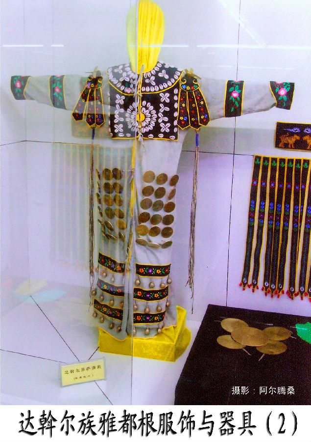在達(dá)斡爾族人部分轉(zhuǎn)向農(nóng)業(yè)生產(chǎn)后,他們的觀念意識也發(fā)生了一些變化,雅德根服飾隨之有所演變,雙肩的鳥使者為布谷鳥所替代,成為春天的使者,神肩上360個海貝飾品表示360天,24條長短飄帶象征農(nóng)歷的24個節(jié)氣 。