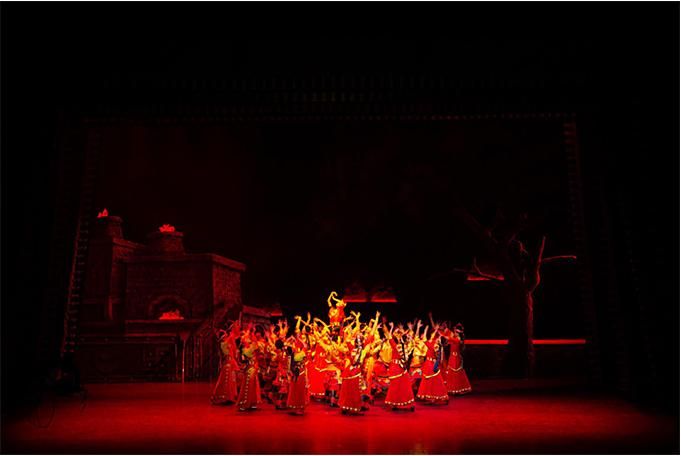 在手段創(chuàng)新上,主創(chuàng)人員在嚴(yán)格遵循南木特藏戲藝術(shù)傳統(tǒng)和戲劇原則的基礎(chǔ)上,設(shè)計(jì)了部分新的唱腔,使用了現(xiàn)代舞臺(tái)的舞美和聲光電手段,采用了26人組成的中型民族樂(lè)隊(duì),從而營(yíng)造出了全新的舞臺(tái)效果。在藝術(shù)手法上,還采用了以南木特藏戲手段表現(xiàn)西藏藏戲內(nèi)容的特殊表現(xiàn)形式,以戲中戲的重疊盡顯不同風(fēng)格的藏戲風(fēng)采,大大地豐富了表演手段和出彩看點(diǎn),為觀眾提供了巨大的想象空間。