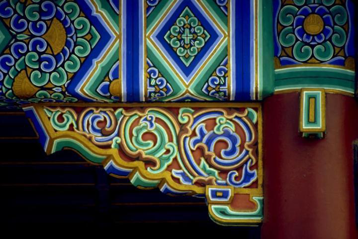 彩畫(huà)著色是一項(xiàng)關(guān)鍵的工序,不能有半點(diǎn)差錯(cuò)。工匠們?yōu)椴煌伾O(shè)定了代號(hào),一米色、二淡青、三香色、四硝紅、五粉紫、六洋綠、七佛青、八石黃、九紫色、十黑煙、十一紅等。將代號(hào)直接寫(xiě)在地仗上,然后根據(jù)色號(hào)將各種色料對(duì)號(hào)入座,涂刷著色一、二遍,待干后再刷一遍光油罩光,以起保護(hù)作用。彩畫(huà)所用色料一般均為各色成品油漆。