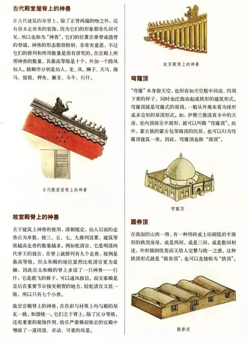 中國古代建筑屋頂不僅樣式多,而且組成部分也有好幾種,主要由屋面、屋脊等部分組成,而且有嚴格的等級制度。