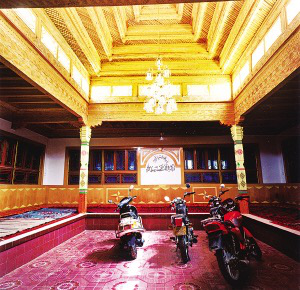 和田的“阿以旺”民居。和田地處塔克拉瑪干沙漠的南部,冬冷夏熱,干旱少雨風又大,蒸發(fā)量是降雨量的幾十倍。為了適應氣候,維吾爾人創(chuàng)造了平頂土房,房內(nèi)居室分冬室和夏室兩部分。在維語中,“夏室”又稱“阿以旺”,建筑前面的外廊,其地面高出院落地面近一米,形如土炕,鋪氈毯,是每年5 ~ 11月份日常生活、待客的主要場所,晚間鋪被褥即可睡覺。設天窗側向采光