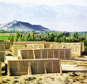 吐魯番曬葡萄干的“陰房”。這里處于我國海拔最低的盆地,也是維吾爾族聚居區(qū),冬冷夏熱,民居既要防寒又要防暑。吐魯番盛產(chǎn)葡萄,每戶皆有曬葡萄干的陰房,因此,住房與陰房合一的民居成了吐魯番的特色。大的陰房都集中建在山坡上,以利運輸,小的陰房