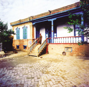 維吾爾族的傳統(tǒng)民居以土坯建筑為主,多為帶有地下室的單層或雙層拱式平頂,農(nóng)家還用土胚塊砌成晾制葡萄干的鏤空花墻的晾房。住宅一般分前后院,后院是飼養(yǎng)牲畜和積肥的場地,前院為生活起居的主要空間,院中引進渠水,栽植葡萄和杏等果木,院內(nèi)有用土塊砌成的拱式小梯通至屋頂,梯下可存物,空間很緊湊。