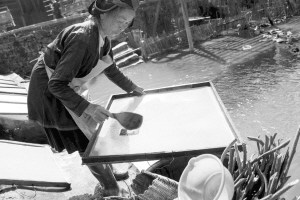 占里村共有182戶827人,這里的侗族古法造紙術(shù)源遠(yuǎn)流長,全村從事造紙業(yè)的就有170戶,占總戶數(shù)的93%。這里的造紙業(yè)依然保留著原始的家庭作坊和世代傳承的手工制作方式。這種古法造紙技藝以構(gòu)樹皮為原材料,添加獼猴桃藤、野棉花根,經(jīng)過水浸泡、石灰腌制、蒸煮、碓爛、攤曬、燒堿漂白、打漿、瀝水、抄紙、烤干等72道工序,最終制成白皮紙。