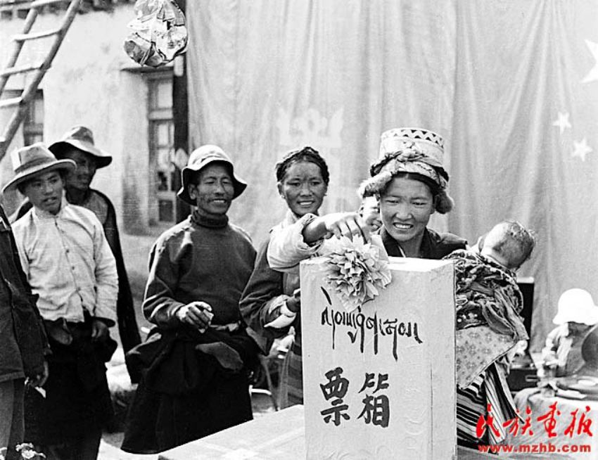 1962年7月,山南地區(qū)乃東縣昌珠鄉(xiāng)的翻身農(nóng)民巴桑卓瑪穿上新衣到選舉鄉(xiāng)人民代表的會場參加投票,她興奮地投下了幸福的一票(蘇俊慧 攝影)