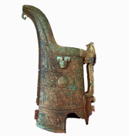 出土?xí)r,銅觥側(cè)置平放,銅壺倒置于銅觥內(nèi)。銅觥重13.45千克,器身呈扁圓形??脊艑<曳Q,該銅觥器形獨特,如突出眼睛的變形獸面紋、“C”形扉棱、羊角騰空設(shè)計的平嘴犧首等,與以尊、罍為代表的殷墟時期南方特征青銅器相一致。