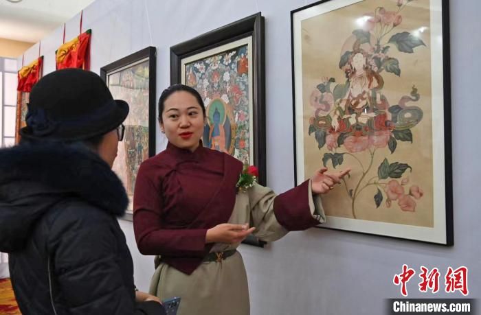王天文是該協(xié)會為數不多的女性,自幼學習國畫。此次她的展出作品《花與佛》進行了唐卡創(chuàng)新,將漢地工筆繪法的花卉與唐卡白度母形象融合。因為熱愛藏文化,2011年她從家鄉(xiāng)河北到西藏學習唐卡,希望能探索唐卡與不同繪畫種類方式的結合。