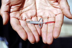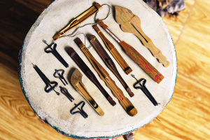 安宇歌介紹,口弦都是純手工制作的,最難制作的部分是能發(fā)音的中簧。制作中簧時(shí),選取原料須是圓形鋼絲,先要將其砸扁,兩邊是尖的,整個(gè)簧的距離由寬到窄,窄的部位向上折彎成鉤,留兩公分長(zhǎng)度,再折一小鉤。并且,中簧需高溫淬火,這是一個(gè)難度極高的環(huán)節(jié),全憑手感。如簧不淬火便會(huì)彈性不好,淬過了頭則一彈就碎,淬不到位會(huì)導(dǎo)致彈撥口弦時(shí)所發(fā)的聲音不佳。從某種程度上講,用口弦彈奏的音樂之所以引人側(cè)耳,關(guān)鍵就在這根中簧上。