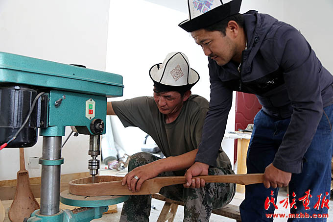 這間工作室的主人叫阿吉別克·買買達洪,主人恰巧有事外出,他的弟弟,年輕朝氣的吾蘭別克張羅著給記者們當起了翻譯。正忙活著打磨樂器的小伙叫木沙,今年31歲,問起庫姆孜的制作工藝,他才把頭抬起來,笑著說:“我做這個十年了。一把庫姆孜,往往琴身是杏木,蓋子是松木。杏樹、松樹木切割后放在干燥的地方,一兩年后才能用。”庫姆孜有三根弦,琴弦以前用動物的腸子手工自制,現(xiàn)在有的工匠開始使用現(xiàn)成的弦。判斷庫姆孜手工藝人手藝高低的關(guān)鍵何在?木沙解釋說,“要看彈出來的聲音。木頭的原料不同,出來的聲音也不同?!边@個回答似乎也隱藏了手工藝人的絕活所在,可意會不可言傳的技藝,往往在一代代的工匠手中以師徒親授的方式傳承。