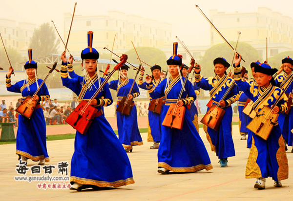 肅北蒙古族自治縣烏蘭牧騎于1974年成立,屬大西部特殊的專業(yè)文藝團體之一。主要以搜集整理、改編和創(chuàng)作富含民族特色的歌舞節(jié)目為己任,以發(fā)展性傳承的方式,推陳出新肅北特有的民族文化。從1980年以來,地方政府和專家學(xué)者還組織了工作隊走訪藝人,搜集了許多民歌、英雄史詩等,出版刊印了《肅北蒙古族贊祝詞輯錄》、《肅北蒙古民歌》(蒙文)等書,這些舉措使雪山蒙古人的傳統(tǒng)歌舞和民俗以文本的形式得以保存。1983年9月,肅北烏蘭牧騎自編自導(dǎo)、獨具地方特色的《響鈴舞》和《馬頭琴演奏》,參加全國烏蘭牧騎文藝匯演,受到教育部嘉獎。這也在無形中增強了肅北蒙古人的民族自豪感和民族凝聚力。