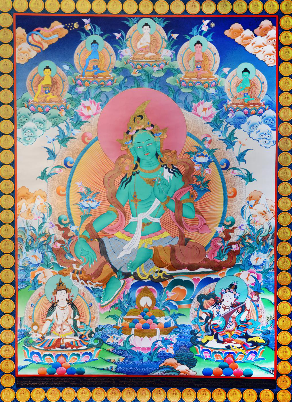 綠度母坐菩薩座于蓮花月輪上,雙腳屈左展右,左腿單坐,右腿向下舒展,踏在蓮花上表示隨時(shí)準(zhǔn)備起身救度苦難眾生,如慈愛的母親一般,拯救鐘愛的孩子;