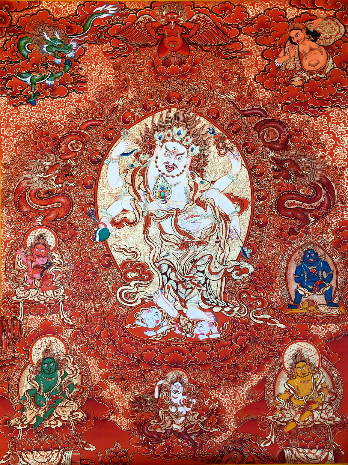 六臂白瑪哈嘎拉正名為白如意珍寶依怙主 。首宏於香巴噶舉,后另傳至薩迦派分支,為特別不共法門,是求財?shù)闹腔圩o法,相傳此尊住於印度清涼尸陀林。此尊身白色,一面六臂三目,須眉毛發(fā)金黃,獠牙外露卷舌相。頭戴寶冠,珍寶瓔珞,天衣彩裙為身莊嚴(yán),身材短胖,并有小鈴華蔓為飾。兩腳作巡行狀,踏於持寶鼠之白象王財神之背。