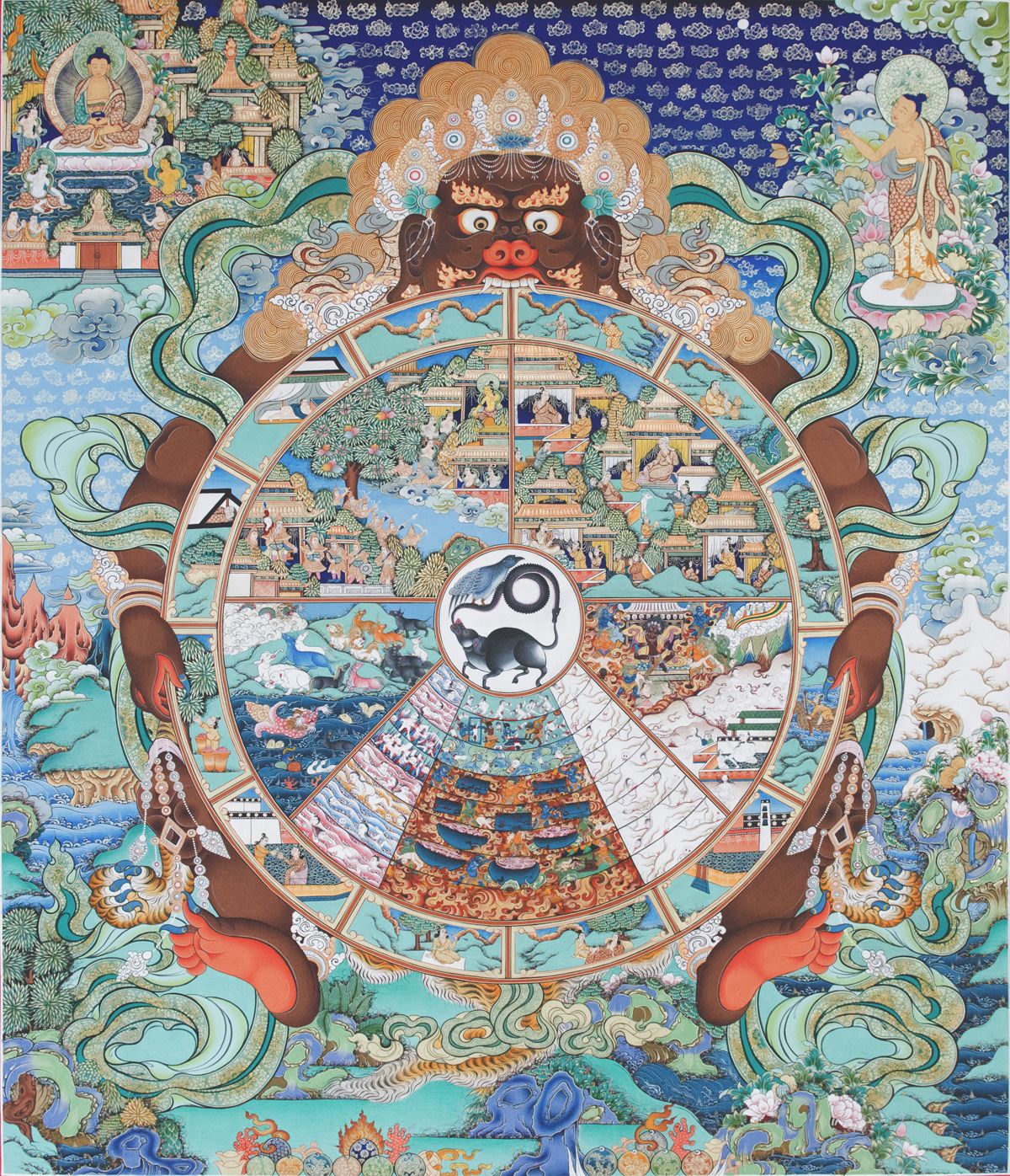 一切有情,皆以諸欲因緣,自作自受,如車輪回轉(zhuǎn)不已,生死于六條道趣,接受制裁。所謂六道,即:人、天(化生)、阿修羅(魔)、地獄、餓鬼、畜生(三惡道)。然在六道中,卻以人道為中心,因人心的善惡觀念而隨心所欲的去追求,造成報(bào)果。如人在日常中的語言、動(dòng)作、思想,守法實(shí)踐持三戒(五戒:不殺生、偷盜、邪淫、妄言、飲酒)以上者,可得六根整然的人身,五戒圓備者,即生大富大貴之家,長壽而揚(yáng)名于世。修持五戒,加行十善(身:不殺生、偷盜、邪淫??冢翰粣嚎?、妄言、綺語、兩舌。意:不貪、瞋、癡。),即生天界,天分為欲界天、色界天、無色界天。上述五戒加十善,乃生欲界天,再加修正觀坐禪,證初禪至四禪,即生色界天。趨入四空定,即生無色界。但雖至非想非非想天,還是降伏業(yè)惑而已,無法脫離生死輪回,故古人說:三界無安,猶如火宅。如果人于日常生活中,雖有十善心布施,但帶有名利好勝,即生阿修羅界(須彌山腰),阿修羅是具天福而缺天德,因地污曲所致。如果人于日常中,失去道德戒行,生起慳貪心,即墮餓鬼道界,生起瞋癡心,即墮畜生界,犯五逆十惡者,即墮地獄界。以上釋義引自《君友會(huì)、六道輪回卷》綜上:六道輪回的善惡報(bào)趣,盡在人心的一念,能趨于善,即上升天界,起一念惡,即墮惡道,因果昭彰。