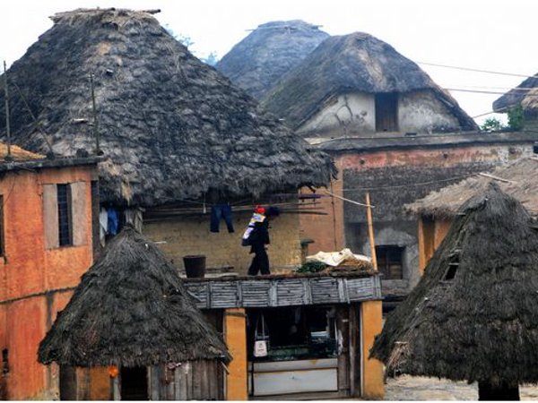 蘑菇房由土基墻、竹木架和茅草頂組成,屋頂為四個斜坡面。房子一般分三層:底層關牛馬堆放農(nóng)具等;中層用木板鋪設,隔成左、中、右三間,中間設有一個常年煙火不斷的方形火塘;頂層則用泥土覆蓋,既能防火,又可堆放物品。蘑菇房造型美觀,別具一格。冬暖夏涼。