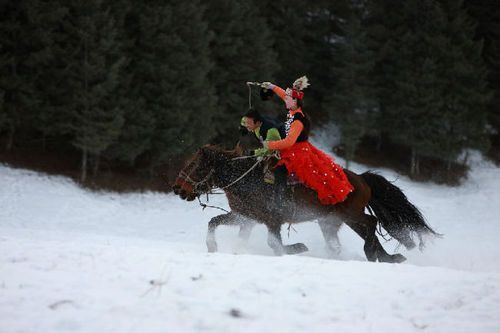 在傳統(tǒng)的竟技比賽場上,最激動人心的還是“姑娘追”它往往是全場比賽的壓軸戲?!肮媚镒贰?據(jù)說是由上古“追姑娘”的風(fēng)習(xí)演變而來,至今既是哈薩克人最喜愛的娛樂項(xiàng)目,又是小伙子找對象談情說愛的好機(jī)會。
