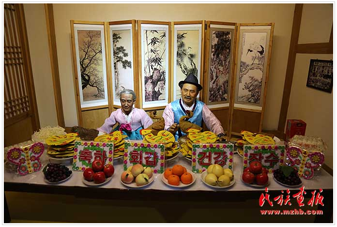 朝鮮族人民非常注重禮節(jié),尤其崇尚尊老愛幼的傳統(tǒng)美德。步入廳堂,回婚禮(為紀念結(jié)婚60周年而舉行的賀禮)中,新郎新娘的蠟像引得大家駐足觀看,新郎的衣著形似明朝時期的官服,頭戴官帽,據(jù)說“新郎官”的稱謂就由此而來。隆重的回婚禮教育人們忠于愛情,也是儒家思想中“修身齊家治國平天下”中的“齊家”思想的延續(xù)。走進另一廳堂,朝鮮族的花甲禮,六十為一甲子,花甲之意來源于此。花甲禮是朝鮮族家庭為60歲老人舉行的大型生日宴。在擺滿各種花色的食品的“大席”前,兩位老人面南端坐,接受兒孫、親朋好友的跪拜與祝福。