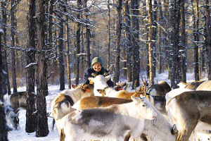 這片雪原是內(nèi)蒙古自治區(qū)大興安嶺北坡南段的苔原森林,現(xiàn)在有阿龍山鎮(zhèn)、阿龍山林業(yè)局和一個(gè)鄂溫克獵民放鹿的營(yíng)地。這個(gè)獵民點(diǎn)有3戶6口人和300多只馴鹿。前幾天,鄉(xiāng)里來(lái)慰問(wèn),給每戶送來(lái)了米面、豆油、餃子、豬肉和200元錢。獵人們也拿到了2008年的鹿茸款,最多的有兩萬(wàn)元左右,少的也有四五千元。每家都派人到山下采購(gòu)年貨,有新衣服、酒、糖果、點(diǎn)心,有孩子的玩具和零食,當(dāng)然還有禮花鞭炮。
