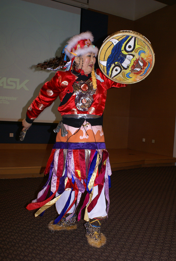 鼓是一種十分古老的打擊樂器,制作簡單,使用范圍廣,因此在赫哲族中非常流行。民族學家凌純聲在20世紀30年代調(diào)查時發(fā)現(xiàn),赫哲人幾乎家家有鼓。在當時,赫哲族使用的鼓,可以大致地分為三類:薩滿用的橢圓形鼓、“阿哈瑪法”用的圓形鼓和普通人家用的鼓。前兩種鼓均為單面鼓,雖然其大小略有不同,而其用法大致相同,即主要用于宗教活動和民間祭祀。這兩種鼓既是薩滿的法器,又可以當樂器使用。無論是在薩滿跳神之時,還是在每年的鹿神節(jié)之際,薩滿鼓都是為人們伴舞的主要樂器。普通人家的鼓比薩滿鼓小得多。