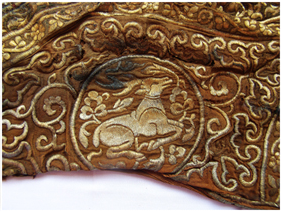 現(xiàn)在,我們就看見一只鹿,靜臥于金繡弓囊的中央。飛揚(yáng)流動(dòng)的黃金絲線勾勒出它宛如花朵一般的角,流露出遠(yuǎn)古神話對于鹿角神力的幻想和贊美。它以溫柔、嫻靜、優(yōu)美的姿態(tài),安祥地伏于卷草花卉紋中。曾經(jīng)與之相伴的弓影早已遠(yuǎn)去,嗖嗖作響的箭聲也已留在歷史那端?,F(xiàn)在,它遺世獨(dú)立。