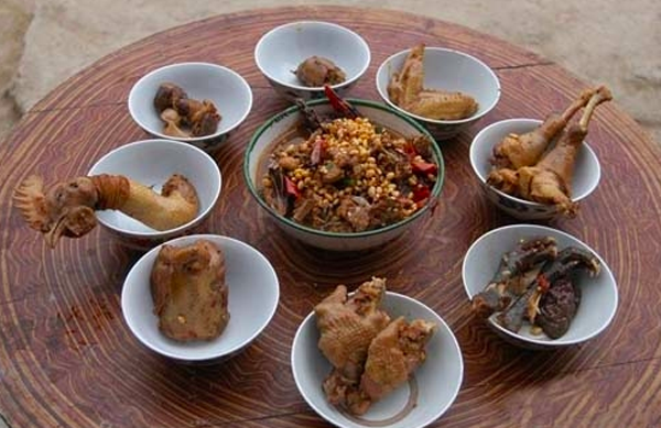 “頭”:第一種說法是頭給主人,稱之為“頭不出外”;第二種說法是給客人,表示尊敬;第三種說法是布依族青年男女訂婚時,吃頭的人要把雞腦先剝?nèi)〕鰜斫o大家看,稱之為“吃雞還雞”(因為一個完整的雞腦就活像一只小雞娃),“卦”兩只,原則上是主、客人各一只,稱之為主客平等,表示友好往來。布依族辦紅白喜事或是過年時,都要看“卦”,測算辦的喜事是否吉祥,來年五谷豐登,六畜興旺等,稱之為“吃雞看卦”??础柏浴钡膬?nèi)容多,道理也比較深奧。其余部位按對象依次分配,它的解釋也較多,吃“雞八塊”時最為講究的有兩點:一是須由主人分配,得“頭”的人號召后,方能開席。二是對好“卦”、吉祥“卦”,主人都將其放在自家神堂上。以示四季平安,吉祥如意。