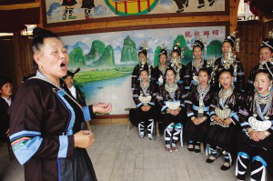 2012年6月6日,中國(guó)非物質(zhì)文化遺產(chǎn)保護(hù)中心在北京向全國(guó)60位傳承人頒發(fā)了“中華非物質(zhì)文化遺產(chǎn)傳承人薪傳獎(jiǎng)”,吳品仙是貴州唯一獲得此獎(jiǎng)項(xiàng)的侗族大歌傳承人。談到侗歌時(shí)她如數(shù)家珍,翻開(kāi)幾大摞侗族大歌的資料說(shuō):“我用30年時(shí)間整理的1700多首侗族大歌,覆蓋了黎平縣的91個(gè)侗族寨子的。因?yàn)槎弊鍥](méi)有文字,我用同音的漢語(yǔ)記錄了侗語(yǔ)歌詞,把每首侗歌的發(fā)音用簡(jiǎn)譜譜了曲,便于后人傳承研究?!?/p>