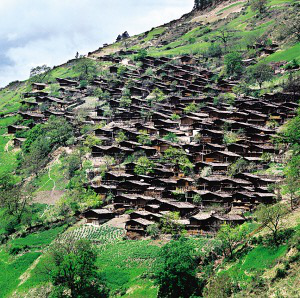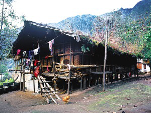 在怒江上游峽谷聚居的傈僳村寨都建在高山的半山上,其民居俗稱(chēng)為“千腳落地房”。說(shuō)“千腳落地”雖有些夸張,但也足以形象地說(shuō)明峽谷溫?zé)岬臍夂蚝蜕礁咂露傅牡乩項(xiàng)l件。在雨季時(shí),“千腳”阻力最小,使山洪順利傾瀉而下,又很快干爽,免受潮氣。而且不需挖地動(dòng)土,不必移石砌墻,對(duì)木料沒(méi)有過(guò)高要求,長(zhǎng)短皆用,在生態(tài)脆弱的高山峽谷也算環(huán)保建筑?!扒_落地”是因建房時(shí)先在確定的屋基上依斜坡程度和住房面積打進(jìn)數(shù)十根到百余根木樁為基樁,以保證居室樓板的平正?;鶚洞蚝煤?,除四面留幾根高柱作為整個(gè)房屋的立柱外,在密集木樁所形成的平面上滿(mǎn)鋪竹篾編織的樓板,還有竹篾圍墻,所有結(jié)構(gòu)皆用竹篾綁扎。屋頂鋪苫草或蓋木片瓦,近幾年,已陸續(xù)換上了大塊的水泥波形瓦。房門(mén)開(kāi)在山墻一側(cè),有廊道,可做曬臺(tái),平時(shí)穿的衣服都搭在這兒,也是婦女做針線活的地方。隨著怒江峽谷的開(kāi)發(fā)和新農(nóng)村建設(shè)的深入,通路的村寨將很快會(huì)改變面貌。