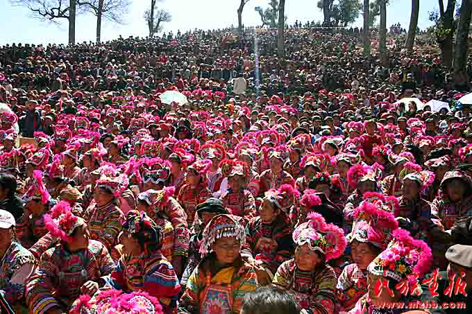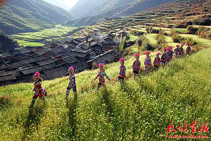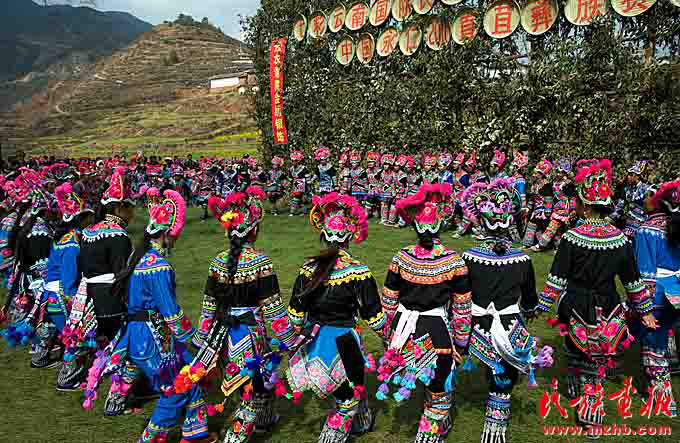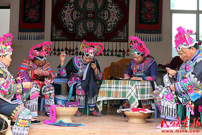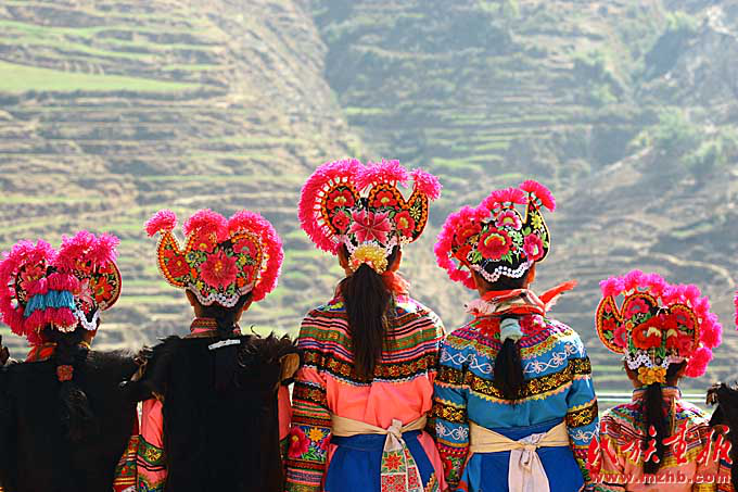 彝族姑娘們頭上戴著繡有馬纓花圖案的傳統(tǒng)雞冠帽