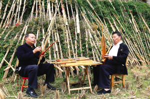 隨著日子的臨近,有些村寨的蘆笙手干脆包米包菜到莫師傅家守候和督促。大量訂戶的到來使莫師傅的工作室變得擁擠不堪。莫厭學、莫里學兩兄弟干脆把制作蘆笙的工作室搬到室外,把最近2個月來制作的1077把蘆笙也搬到室外逐一進行檢修和校音。