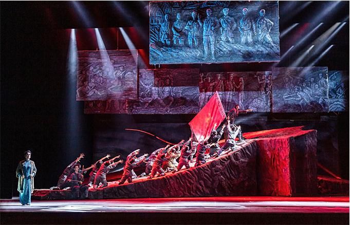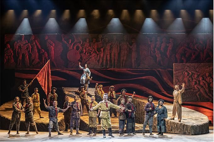 在舞蹈語(yǔ)言的設(shè)計(jì)上,編導(dǎo)融入當(dāng)代元素,使觀眾不但感受到審美的親切與現(xiàn)代感,而且還自然地進(jìn)入回望歷史的情境,對(duì)其思想內(nèi)涵的理解更為準(zhǔn)確。該劇的道具使用和調(diào)度也頗為大氣,令人印象深刻。一組斜坡狀的大型舞臺(tái)道具不但由群眾演員直接移動(dòng)而實(shí)現(xiàn)即時(shí)的場(chǎng)景調(diào)度,還可使演員上下和左右而行,最終組合成巨大的中國(guó)共產(chǎn)黨黨徽,輔助完成了人民英靈和英雄的形象塑造。
