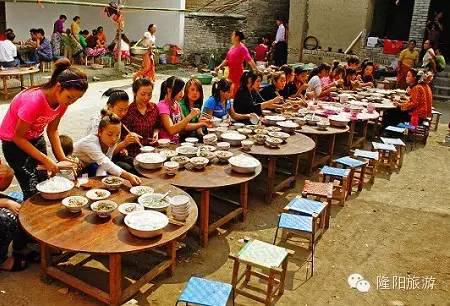 男方家也得請客。新郎啟程去接新娘子,家里馬上就殺雞做飯,新郎新娘回來后要吃染成黃色的糯米飯和雞肉,表示往后生活美滿幸福,像糯米飯一樣結(jié)成團永不分開。晌午時分,是新郎家待客最熱鬧的時候,幫廚的人擺上各種酒菜,親朋寨鄰老老少少全坐到天井里,歡歡鬧鬧地吃飯。最后,客人們有的陸續(xù)走了,愿留下的湊攏幾桌,邊喝酒邊暢談,一直要吃到第二日還不歇。