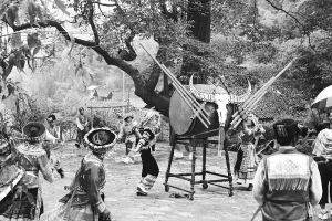 每年農(nóng)歷正月初二至十五花山節(jié),主人與遠(yuǎn)道而來的客人共同歡慶。他們圍成一圈,喝著燒酒,跳起歡快的苗家舞蹈,唱著動(dòng)聽的民歌,一天的勞頓、一年的艱辛,被熱烈的燒酒驅(qū)趕著,被歡愉的歌舞浸潤著,被悠揚(yáng)的蘆笙旋律激蕩著。蘆笙、燒酒、蠟染,精美古樸的苗族服飾,木槽里錘打的糍粑……與四周山山水水一同融匯,幻化成一個(gè)民族的標(biāo)識(shí)。