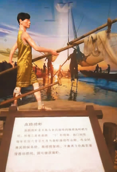 廣西東興市京族文化傳承與保護中心展出的京族捕撈傳統(tǒng)——高蹺撈蝦,也就是現(xiàn)在學(xué)生們學(xué)習(xí)的高腳罾。記者 龐革平攝