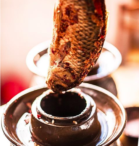 每逢初秋時節(jié),苗家人競相腌酸魚。他們從田間或河里捕回鮮魚,剖腹去內臟,加入食鹽、辣椒粉、拌勻后腌兩三天,然后放進壇子內,一層魚加一層糯米粉、包谷面,密封半個月左右即成。有的苗家將魚鹽漬三五日,曬干后往魚肚內裝滿半熟的小米或粗米粉,然后裝入壇中,密封壇口,倒置淺水盤內。經(jīng)半個月后鹽浸透,性變酸,色澤橙黃,肉質酥嫩,取出生食,未聞腥臭,且酸香可口,津津有味。