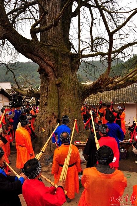 苗族寨老引領(lǐng)眾人來到寨中央的千年銀杏樹下進(jìn)行祭樹,寨老高舉牛角、男人們吹起蘆笙圍著古樹轉(zhuǎn)圈,司儀唱起“古歌”祈禱。寧堅(jiān)攝影,引自民族畫報(bào)