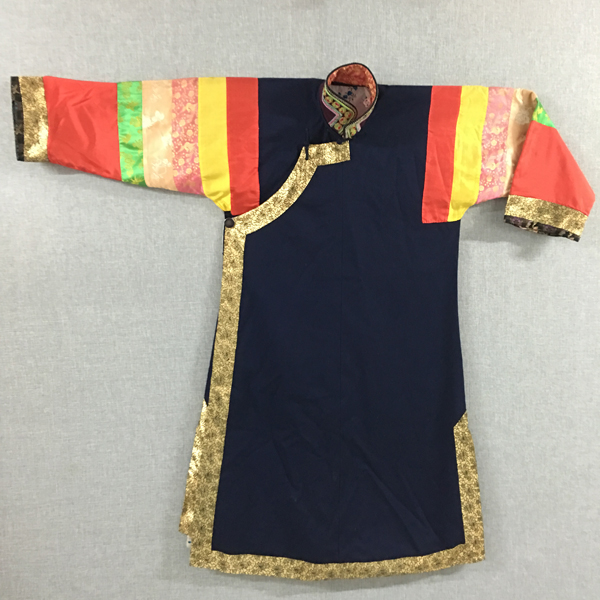 民族文化宮博物館收藏的這件立領(lǐng)右衽大襟五色袖“彩虹衣”,是土族女子盛裝時的一種服飾,征集于青海省互助土族自治縣。年代為20世紀30年代。“彩虹衣”長117厘米,胸圍120厘米,袖長59厘米,棉質(zhì)。整件女服右衽大襟,藍棉布襯里,左右側(cè)開衩,黑色“拉花”立領(lǐng),領(lǐng)上以土族傳統(tǒng)刺繡工藝—盤繡刺繡紅綠相間圓形圖案和辮形線條,綴三枚金色圓銅扣。衣袖為紅、黃、綠、白、粉五色彩布、彩緞拼接的“彩虹袖”,其中紅色為主色,占整個衣袖約一半面積,其余四色布塊相鄰,均勻分布于衣袖上方,布塊上刺繡有金色梅、蘭、竹、菊圖案。衣袖袖口鑲寬約3厘米黑色絲絨底刺繡花邊,花邊里外均繡有花草紋樣,做工精致?;ㄟ吷辖訉捈s10厘米金色牡丹紋花邊,與襟邊、下擺、衩口等處所貼金色牡丹紋花邊相互呼應(yīng),極富設(shè)計感。