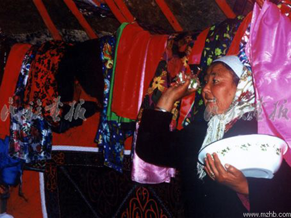 新婚喜宴開始的時(shí)候,客人先按照哈薩克人的習(xí)慣洗手,用主人準(zhǔn)備的毛巾擦手,然后,按年齡的長幼圍坐在地氈上。主人把油炸的包爾沙克,香噴噴的手扒肉,色、香、味俱全的抓飯一盆接一盆地端來。吃完這些,大盆的肉湯或馬奶端到客人面前。哈薩克人對馬奶有著特殊的感情,他們喝完一碗又一碗,興高采烈,眉飛色舞。