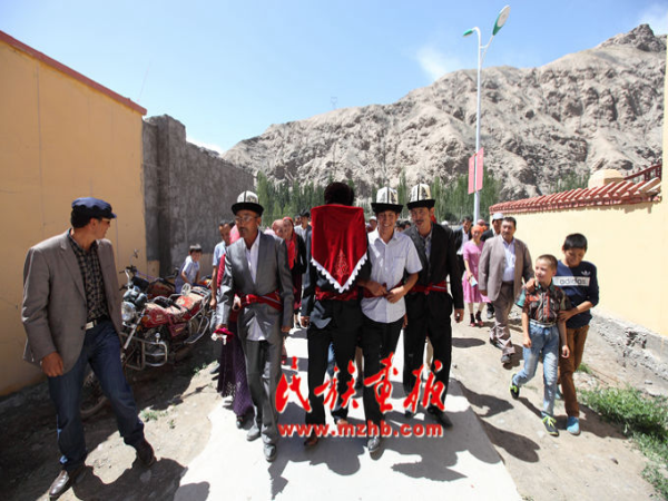 烏爾都隆窩孜村離鄉(xiāng)政府不遠(yuǎn),到達(dá)這里時(shí),兩排土黃色的牧民新居與遠(yuǎn)處的昆侖山已經(jīng)讓我們感受到濃濃的別樣風(fēng)情。其中一戶門前人頭攢動(dòng),聚滿了很多人。不用說(shuō),這里就是舉辦婚禮人家的住處。
