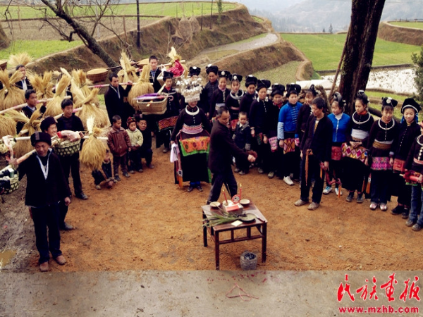 送親隊(duì)伍來到新郎家的寨口,寨老為新娘主持“回喜神”儀式