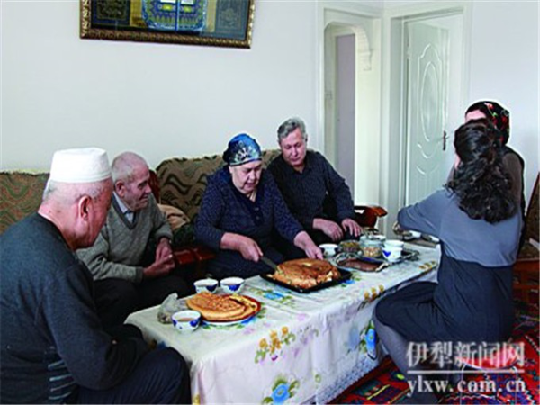 整個(gè)制作過(guò)程,兩個(gè)老人有一搭沒(méi)一搭地聊著天,準(zhǔn)備食材,互相搭把著手。屋外客廳里,她們的丈夫一邊看著電視一邊等,其樂(lè)融融,倒讓人感覺(jué)到一種歲月靜好的美感。待屋子里到處都飄蕩著拜列西濃烈誘人的香味時(shí),大家的味蕾都被調(diào)動(dòng)起來(lái)。就在這當(dāng)兒,買(mǎi)斯胡旦的弟弟帶著弟媳也來(lái)了。兩口子熱鬧,一開(kāi)門(mén),爽朗的笑聲就飄進(jìn)門(mén)。弟媳說(shuō):“嗨,我這兩個(gè)姐姐手可是巧得很!”弟弟說(shuō):“做了這么好吃的東西,沒(méi)人來(lái)吃怎么能成!”