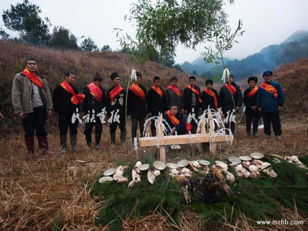 到招龍儀式活動點時,已是凌晨五點半,我們所在的位置是一個山腰,有一個小壩子。我發(fā)現(xiàn)參加儀式的只有十二三個人,就好奇地問:“為什么只來十多個人?”原來這些人是選出來的代表,該村有7個村民小組,共203戶,有980多人口,每次招龍大喜時,要從村民中推選出12位作為招龍代表,從頭到尾主持一切事務(wù)。說話間,村里人就開始忙著生火,或準(zhǔn)備各項招龍工作。他們用木板支起一個擺放祭品的臺板,擺上祭品。接著,在招龍師傅的主持下,儀式正式開始。第一個程序是“喊白虎龍”,苗家稱為“共階夸羊捌”,師傅拿著一個白公雞,進行一番念誦后宰殺掉,等雞煮熟后再擺上祭臺。