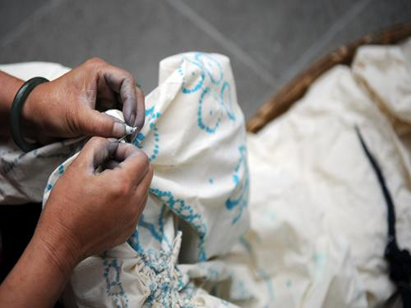 扎染布料為純白布或棉麻混紡白布。工藝過程分設計、上稿、扎縫、浸染、拆線、漂洗、整檢等工序。制作時,根據(jù)人們喜歡的花樣紋式,用線將白布縛著,做成一定襞折的小紋,再浸入染缸里浸染。染色時,將白布上畫好花紋的部分用針線縫起來,外觀上看,像一個個的疙瘩,入染缸中浸染,扎起的疙瘩不會著色,展開后即形成花紋。由于花紋的邊界受到染液的浸潤,圖案產(chǎn)生自然暈紋,青里帶翠,凝重素雅,薄如煙霧,輕芳蟬翅,若隱若現(xiàn)。