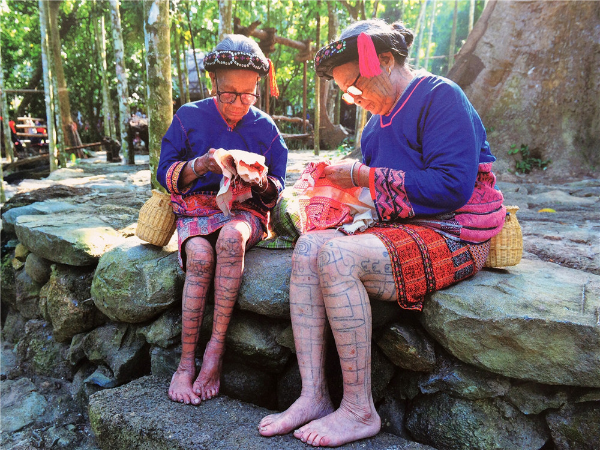 “織”是指使用踞腰織機(jī),采用通經(jīng)斷緯的紡織方法織出各種花紋圖案,在織布時(shí),先手工掛經(jīng),綁住藤或樹(shù)皮布腰帶,用腳踩織機(jī)的經(jīng)線木棍,席地而坐織布??椈ㄊ怯煤谏蛩{(lán)黑色做底線(經(jīng)線),根據(jù)圖案需要,將各種染色的線搭配,拉經(jīng)線、投緯線(彩色線),用木刀打緊緯線,織出各種花紋圖案。