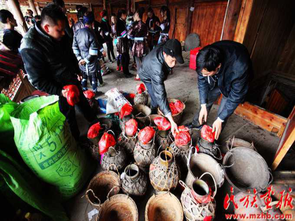 侗族婚俗中還有“買美打油茶”的習俗?!百I美”是音譯詞,是新娘的意思。在舉行婚禮的當天,新娘要打油茶,故而有這么一說。另外,新娘在進入夫家的火塘屋前,要通“兩關”:跨扁擔與穿草鞋。嫁入夫家的第二天還有“挑金水”的習俗。