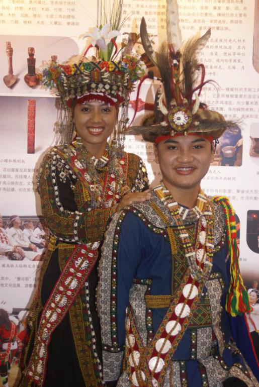 高山族過去以裸身為美,裸形赤足,僅以獸皮、樹皮及植物纖維制作的幅布蔽體,有鑿齒、穿耳的習(xí)俗。接觸漢文化后,逐步形成了男著長(zhǎng)衫、女著裙裝的習(xí)慣,衣服除了獸皮和樹皮外,還喜好用自織麻布,飾以彩色紋樣。